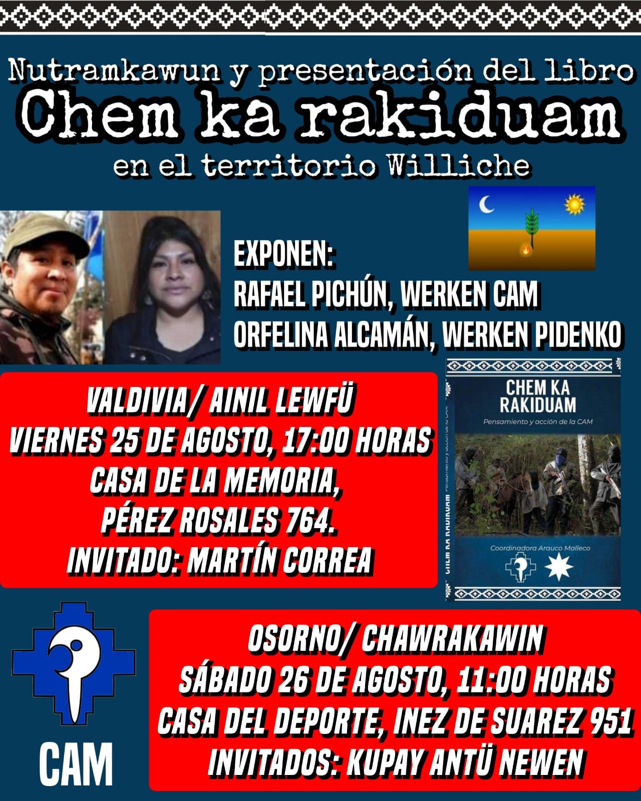 Nutramkawün y presentación del libro Chem ka rakiduam, se efectuará en las ciudades de Valdivia el viernes 25 y el sábado 26 en Osorno, ambos en territorio williche. Participarán de estos conversatorios como expositores Rafael Pîchun: vocero político de la Coordinadora Arauco Malleco (CAM) y Orfelina Alcaman: werken Pidenco. Además como invitado especial para la actividad a realizarse en la Casa de la Memoria de Valdivia, asistirá Martín Correa, historiador y doctor en Antropología, en tanto en Osorno se contará con la participación de Kupay Antü Newen.